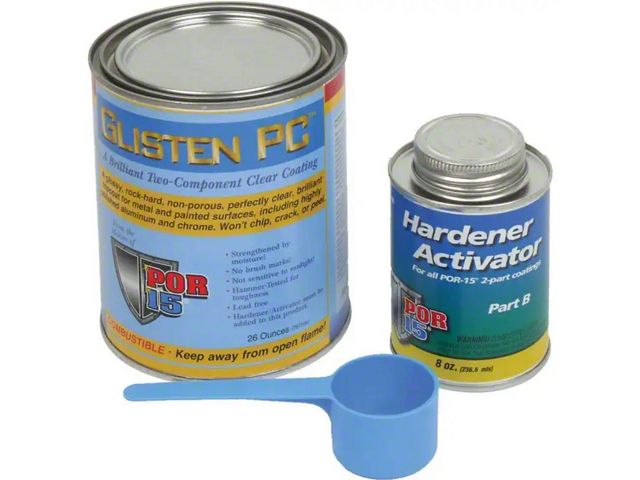 "All that glistens is not gold." How true, but POR-15 Glisten PC, with its high-gloss, rock-hard, water-clear finish is definitely worth its weight in gold. Glisten PC utilizes high-solid, moisture-curing urethane technology to provide excellent adhesion, corrosion protection, flexibility, and UV stability, with tensile strength two to three times higher than other clear coats. POR-15 Glisten PC can be sprayed or brushed to protect wheels, bumpers, polished aluminum, chrome, brass, stainless steel, and existing paint without cracking, chipping, or yellowing. Glisten PC is unaffected by most common chemicals, salt, acids, alkalis, and fertilizers, making it extremely useful in defense against corrosive material--even graffiti! A solvent-soaked rag will wipe away graffiti wi