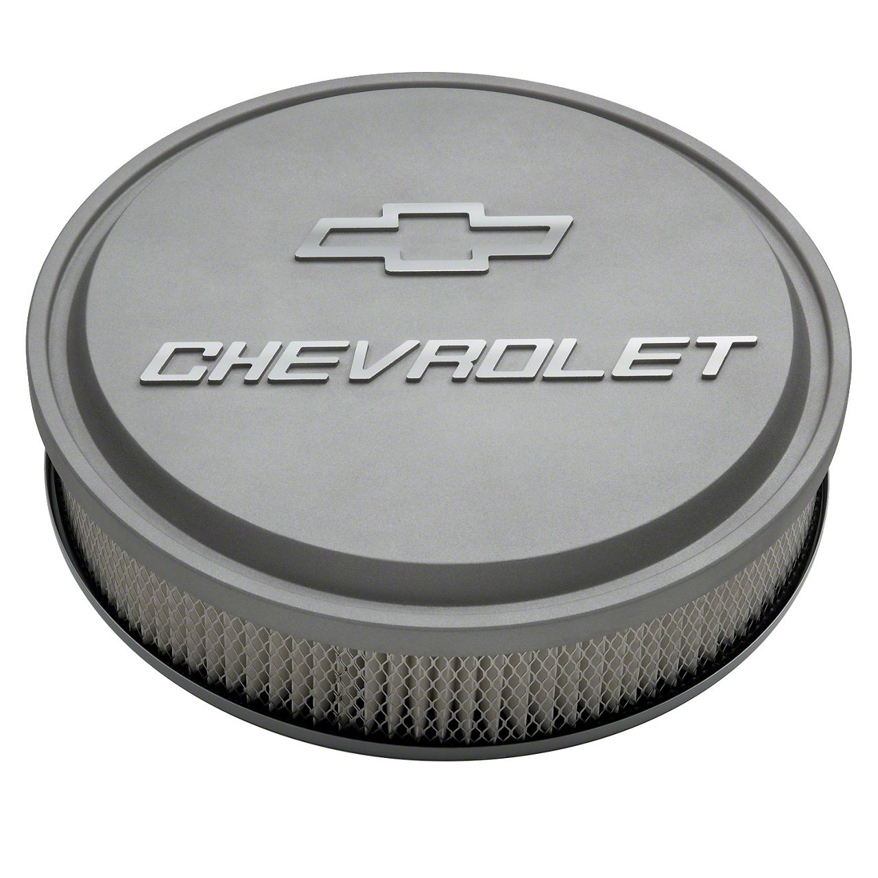 Slant-Edge Carburetor Air Cleaner Kit; 14 Inch Diameter; Features Raised 'Chevrolet' and Bowtie Emblems; Made From Die-cast Aluminum; Cast Gray Crinkle Finish; Paper Filter Included; Sold As One Kit