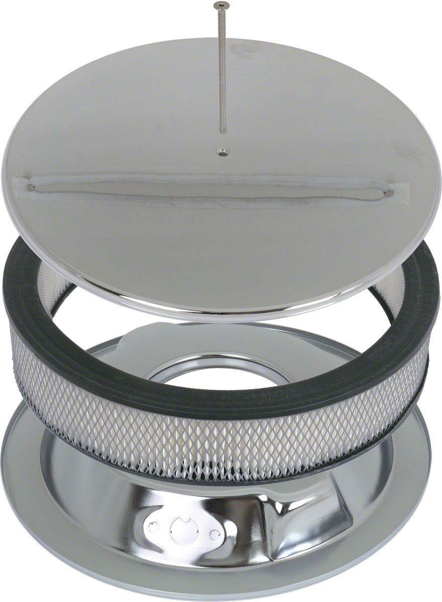 14-Inch Round Aluminum Air Cleaner featuring a smooth chrome top and a recessed base for a clean look! Designed to fit most 4-Barrel Carburetors with 5-1/8-Inch necks. Kit comes complete with a 5-Inch stud and high-flow paper filter element for easy installation.