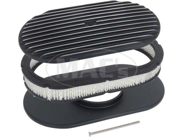 Dress up your classic Ford's engine with this beautiful retro-style finned aluminum 15 inch oval air cleaner from MAC's! It features a black powder-coated, fully-finned top with polished fin edges for a clean, custom look. This air cleaner will fit most stock and aftermarket carburetors with a 5-1/8" diameter neck like most Carter, Edelbrock, Holley, Rochester, and Quadrajet four barrel carburetors. It also has a raised aluminum base to position the air cleaner above the carburetor flange. Each air cleaner comes with a stainless bolt for mounting. Count on MAC's for all of your classic Ford needs.