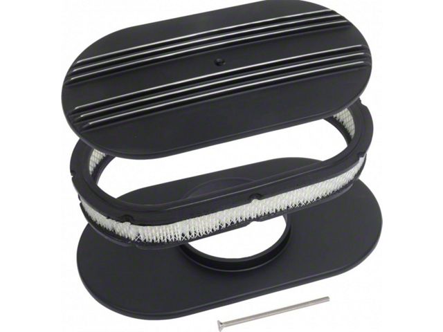 Dress up your classic Ford's engine with this beautiful retro-style partial-finned aluminum 15 inch oval air cleaner from MAC's! It features a black powder-coated, partially-finned top with exposed fin edges for a clean, custom look. This air cleaner will fit most stock and aftermarket carburetors with a 5-1/8" diameter neck like most Carter, Edelbrock, Holley, Rochester, and Quadrajet four barrel carburetors. It also has a raised aluminum base to position the air cleaner above the carburetor flange. Each air cleaner comes with a stainless bolt for mounting. Count on MAC's for all of your classic Ford needs!