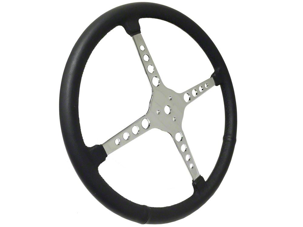 This steering wheel has 4 spokes with holes. They are thicker by design, offering added rigidity for this 15 inch diameter wheel with premium black leather grips.