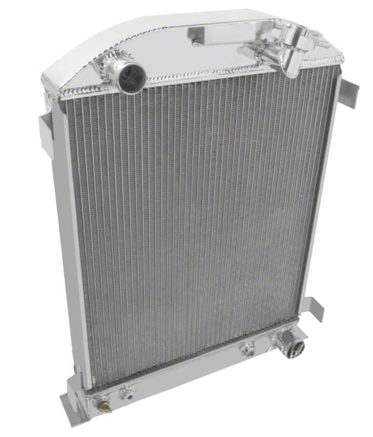 Your classic Ford can get hot... really hot! Driving and idling in traffic on 90+ degree summer days can push your stock cooling system to its limits... and beyond. Factory brass radiators are barely satisfactory at transferring heat, which is why they overheat when you least expect it. Why take chances with your valuable engine? Step up to Champion's all-aluminum, high efficiency radiator. Aluminum alloy is a far superior metal to the original equipment copper-brass construction because it dissipates heat much more quickly and cools down much more rapidly. Heat transfer from your engine to the atmosphere is greatly increased, thereby lowering the temperature of the engine coolant dramatically. An aluminum radiator will out-cool a copper/brass radiator of similar size and construction by a