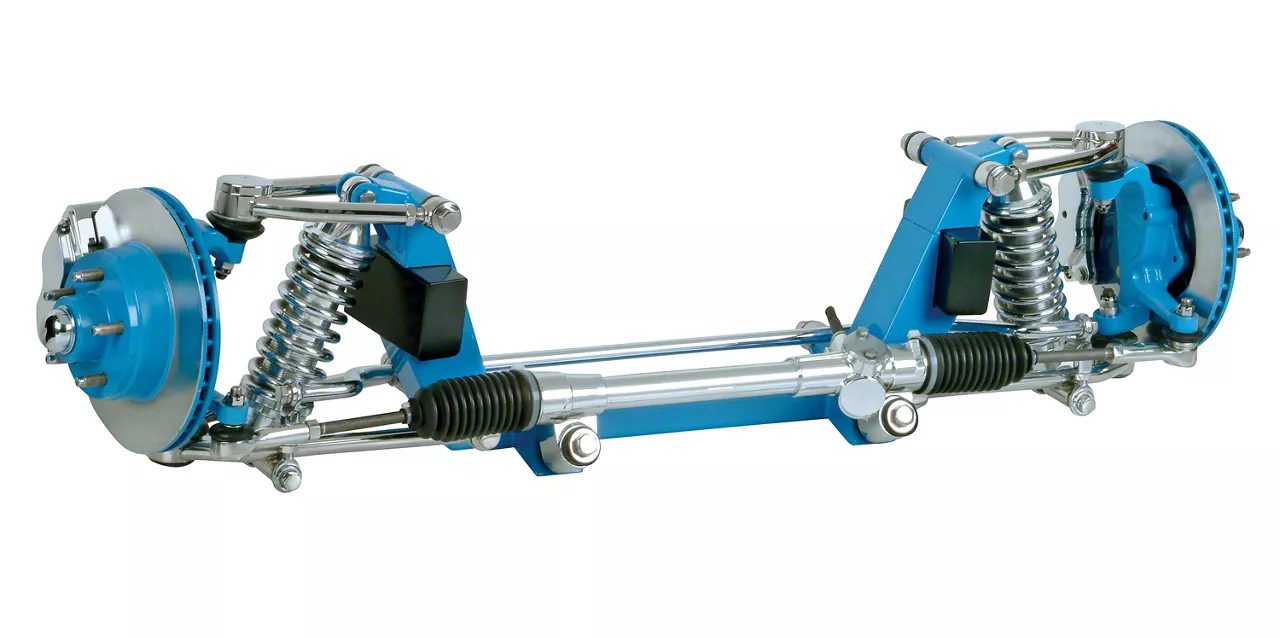 - Kit includes crossmember plain control arms 11'' iron rotors with 4 piston Wilwood calipers manual rack and pinion billet coilovers and springs and spindles