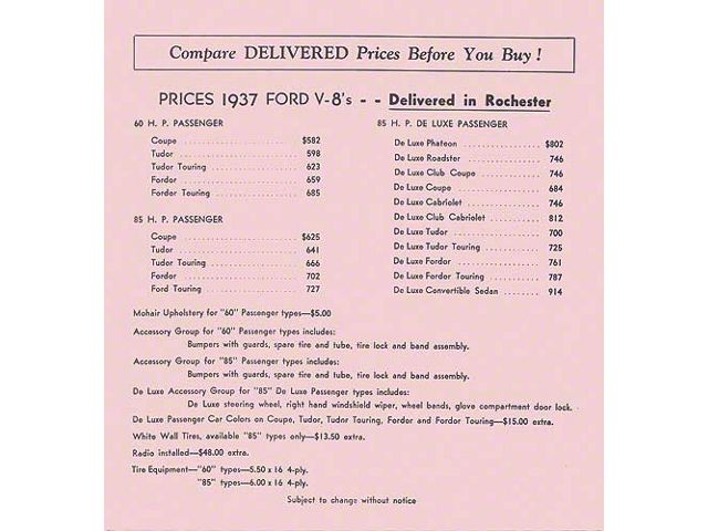 Shows what was on a Ford initially and what accessories were available, detailing the separate pricing for all.