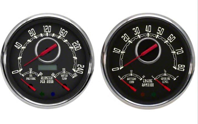 NVU packages for 47-53 Chevy truck offer everything you are looking for in a direct-fit package. Each kit includes 2 4-3/8" gauges installed in our exclusive laser-cut mounting bracket with reproduction OE trim bezels for a perfect fit. Original inspired style has the feel of an original dash with subtle differences, or you can go in a completely different direction to fit the theme of your ride. Kit includes: 240 KPH 4-3/8" Speedometer and 4-3/8" Tachometer Multi gauges. Pressure and temperature and fuel (fuel gauge and sender a