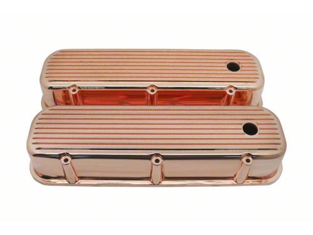 Chevy big block finned copper aluminum valve covers fit 1965-95 Chevy 396-427-454-502 big block engines. Comes with two oil baffles and stainless steel bolt kit. There is one breather hole in each cover. They are the tall style to clear high performance roller rockers.