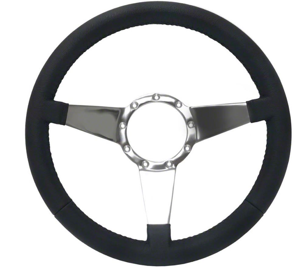Premium black leather sewn over a padded core with polished aluminum spokes in your choice of design will give the interior of your truck a special finishing touch.