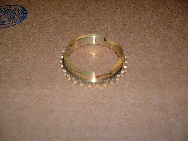 Please note that this ring has 3 slots in it that come unfinished to spec from our only known manufacturer. These slots fit over the synchro clips (or "dogs"). They will need to be measured & filed to the correct size. Measuring from the "gear side" to the bottom of the slot, the measurement should be approximately 0.300". The ring must be carefully supported & the slots filed to the correct height prior to being installed in the synchronizer assembly.
