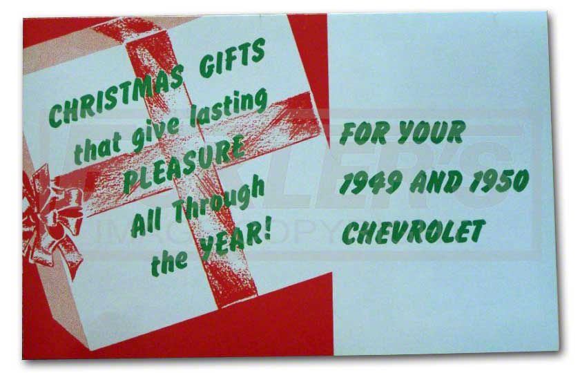 Dealer accessory books offer a little pizzazz to your display at the next local car show. This copy of the original dealer accessory fold out was available at Christmas time between 1949 & 1950. It detailed many of the accessories available for your Fleetline or Styleline so anyone could pick out a great present for you. Eckler's Early Chevy has the best parts at the best price for your 1949 or 1950 Chevy.