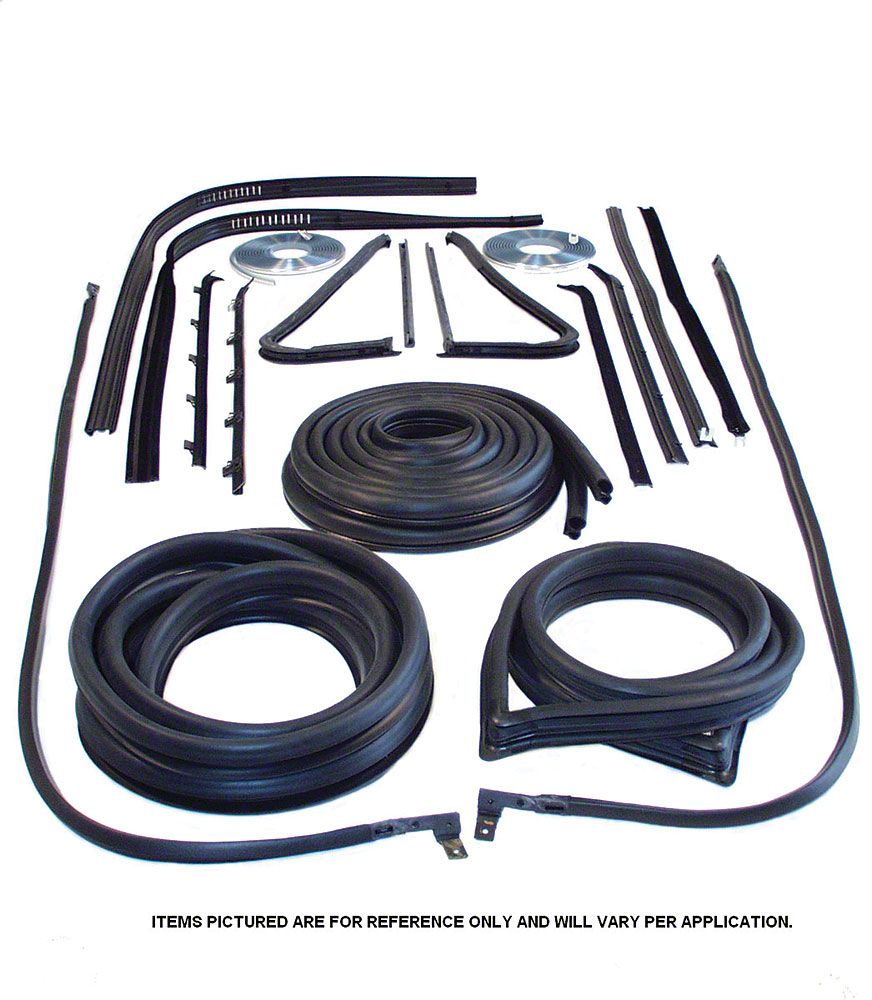 - Complete weatherstrip seal kit- models that accept chrome windshield trim. kit includes: cab windlace, bottom windlace, glue on door weatherstrip, upper channels, chrome style windshield seal with seamed in division bar, beltline kit, rear window seal for 5 window cab.