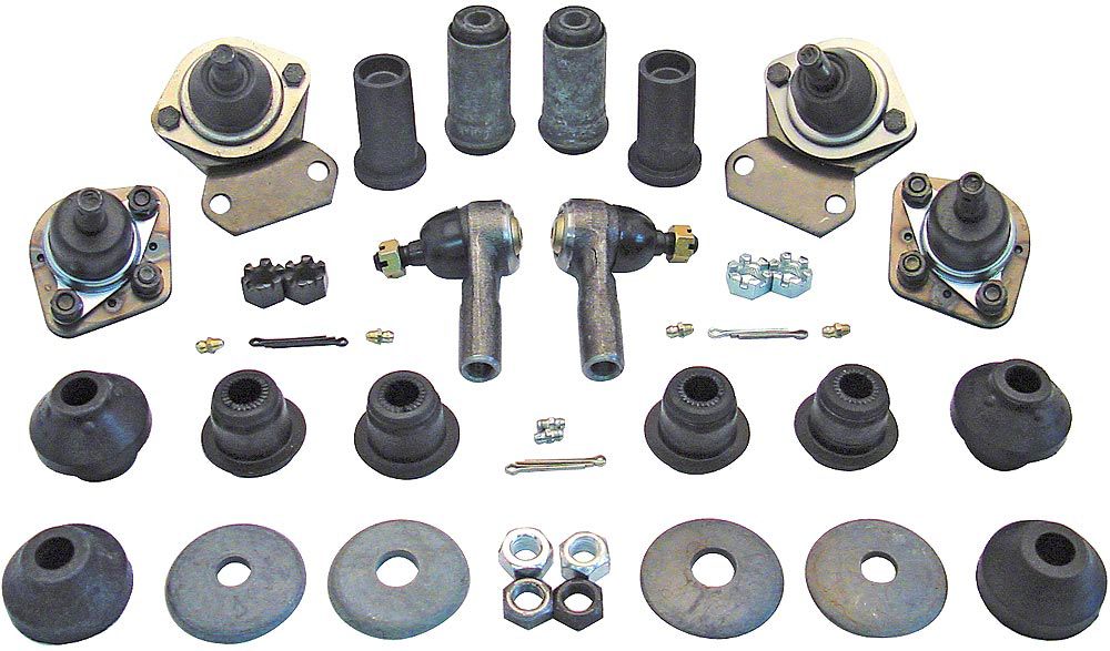 • Includes Strut Rod Bushings, Control Arm Bushings, Rack And Pinion Bushings, Upper And Lower Ball Joints, Tie Rod Ends And Hardware