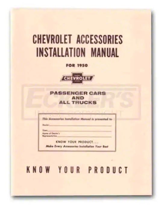 Chevy accessory manuals offer a glimpse into the past. The 1950 Chevrolet Accessories manual from Eckler's Early Chevy is a fun, fact filled look at the accessories available for your 1950 Chevy. Now you can add this companion book to your library. The Chevrolet Accessories Installation Manual is packed full of how to tips on installing all those nifty parts and accessories. The guide covers such topics as radio, antenna, rear seat speaker installation, turn signals and much, much more. With over 100 pages of informative how to?s, this accessories manual from Eckler?s Early Chevy is a must have for your 1950 Chevrolet restoration.