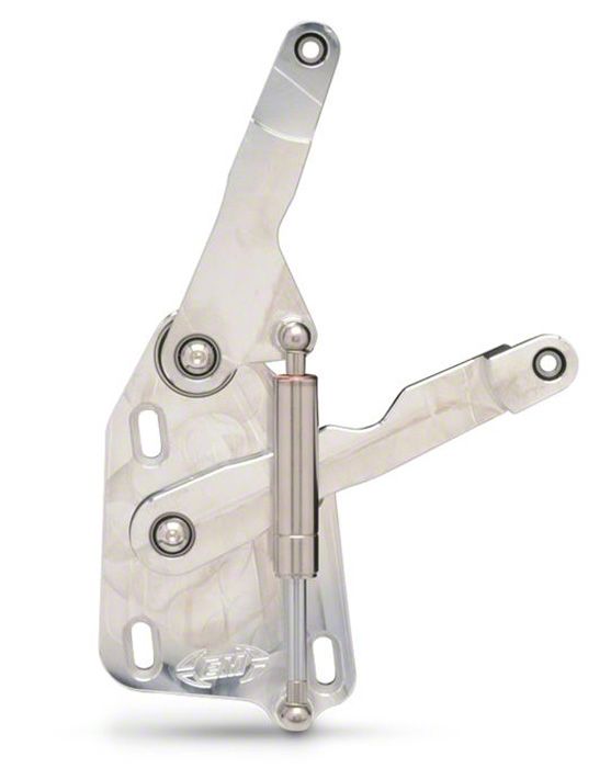Whether you are looking for the ultimate in under-hood customizing or just want to replace your weak stamped-steel stock hood hinges, Eddie Motorsports hinges from Eckler’s are the answer. The hinges are CNC machined from solid chunks of 6061-T6 billet aluminum. Stainless steel nitrogen struts are utilized instead of springs, and sealed ball bearings are utilized at all pivot p