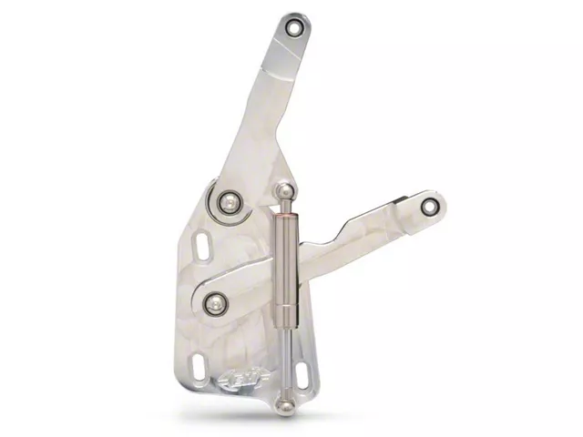 Billet aluminum hood hinges for a Ford pickup truck with a steel hood. Designed as a direct bolt-on to update the standard stamped factory hinge and spring assembly, the hinges are precision CNC-machined from 6061-T6 billet aluminum in the USA. To ensure smooth operation, bearings are incorporated at critical pivot points and stainless steel nitrogen gas struts are included for dampening.