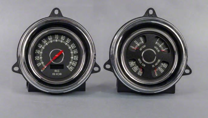 NVU packages for 54 Chevy truck offer everything you are looking for in a direct-fit package. Each kit includes 2 4-3/8" gauges installed in our exclusive laser-cut mounting bracket with reproduction OE trim bezels for a perfect fit. Original inspired style has the feel of an original dash with subtle differences, or you can go in a completely different direction to fit the theme of your ride. Kit includes: 4-3/8" Programmable Speedometer, 4-3/8" Quad Gauge. Pressure temperature and fuel senders(240-33) with adapter bushings. Se