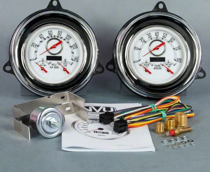 NVU packages for 54 Chevy truck offer everything you are looking for in a direct-fit package. Each kit includes 2 4-3/8" gauges installed in our exclusive laser-cut mounting bracket with reproduction OE trim bezels for a perfect fit. Original inspired style has the feel of an original dash with subtle differences, or you can go in a completely different direction to fit the theme of your ride. Kit includes: 4-3/8" Programmable Speedometer, 4-3/8" Quad Gauge. Pressure temperature and fuel senders(240-33) with adapter bushings. Sea
