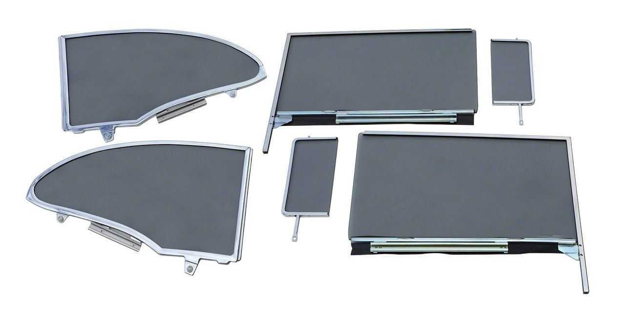Construction and Appearance. Crafted from durable automotive-grade glass and precision-formed metal frames, this set is built to deliver long-lasting strength and consistent performance. The smoke black finish adds a subtle tinted appearance that enhances exterior styling while maintaining a period-correct look. Each frame is carefully constructed to ensure structural integrity, and the included vent frames with latches, door frames, and quarter frames provide a cohesive and refined presentation.