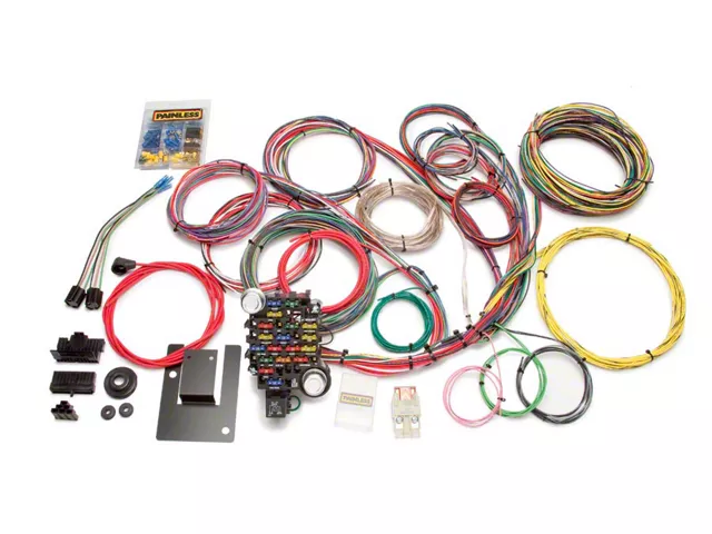 This 28 circuit kit is designed to fit the 1955-1957 "Tri-Five Chevy" and includes additional circuits for power options and accessories. This harness features a factory location Painless mounting plate for the fuse block, and special dash & turn signal connectors. Included with this harness you will also find pre wire plugs for the headlights and each wire is custom printed with the circuit identification as well as using GM color codes for easy installation.