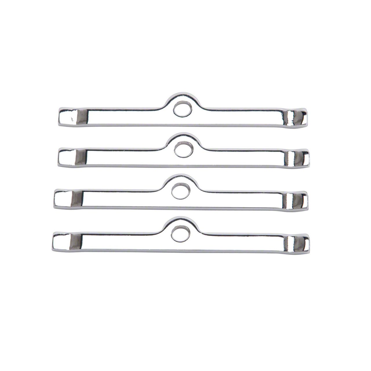 Polished Chrome Finish Adds a Clean, Show-Quality Touch. These hold downs are built from stamped steel for strength and longevity, then finished in chrome to complement polished or painted valve covers. The set includes four matching brackets, allowing for a complete install on V8 engines with two-valve cover setups.