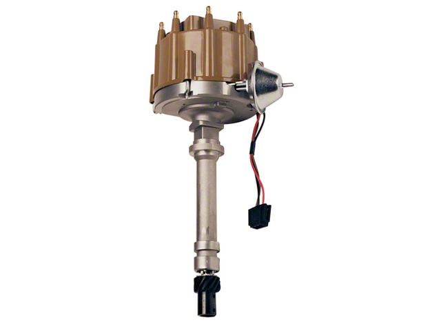 This HEI Distributor fits V8 1955-1982 Engines. It has built-in coil with magnetic trigger, comes without cap and rotor and features a vacuum and mechanical advance.