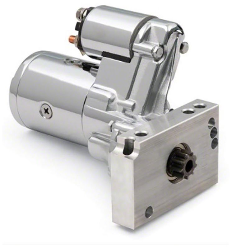 For the chrome that gets you home, this Tuff Stuff 1.9hp gear reduction starter has twice the torque of the original starter making hot start problems a thing of the past. Manufactured with all new parts, it accepts 153 or 168 tooth flywheels and features an adjustable drive-end frame for added oil pan and header clearance. The triple chrome plated body adds a sharp dress-up touch to the engine compartment. New mounting bolts and necessary shims are included.