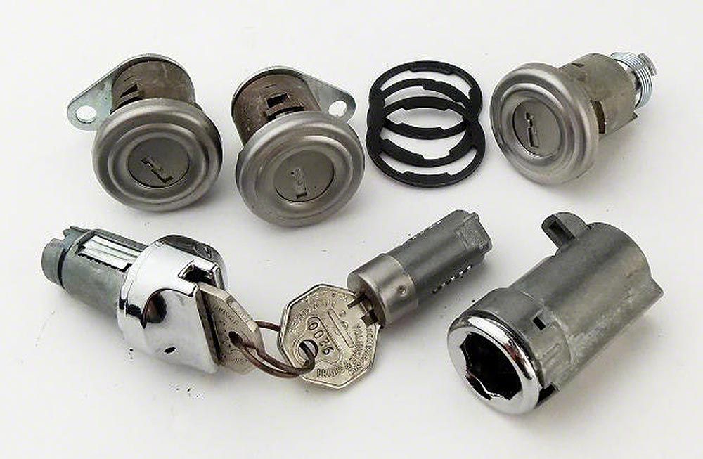 Construction and Appearance. The kit is manufactured to factory specifications, using durable materials to replicate the original components. Each lock is keyed alike, ensuring consistency and ease of use, and the kit includes locks for the ignition, pair of doors, glove box, and trunk.