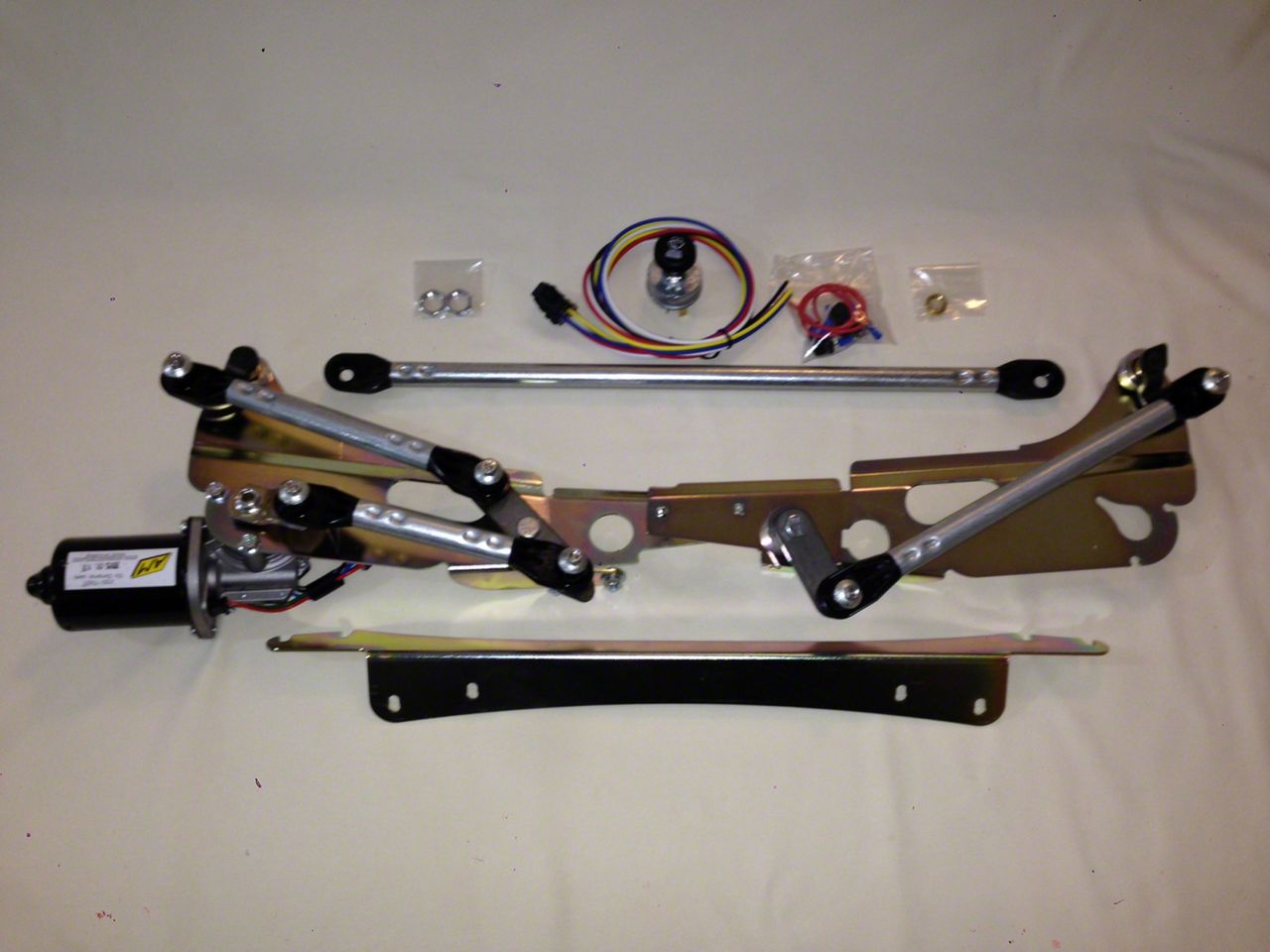 The kit comes complete less assembly lube, arms and blades, escutcheons and model-specific knobs for the switch. All those stock pieces will fit on our system. Escutcheons are the exterior trim bezels which cover the pivot posts in the cowl.