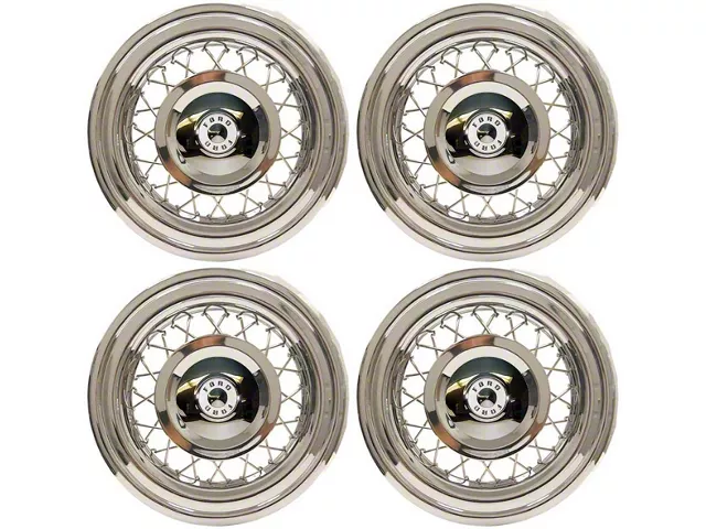 Set includes 4 chrome wire baskets, 4 hub caps with white painted accents and all the retainer clips and rubber bumpers necessary. This set is just like the original accessory. Each wheel uses 2 pieces - a small hubcap goes under the separate wire basket.