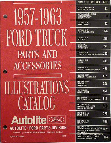 These are reprints of the original parts books that every Ford truck dealer had in its parts department. If a parts man didn't know what a particular part was, he looked it up in the illustrations book. This book has exploded views of virtually all the parts on the truck. These are broken down into sections covering different areas like steering, brakes, rear axle, transmission, etc. The text lists which part numbers belong on which truck. Both the 1948-56 and the 1957-63 text and illustrations are bound catalogs.