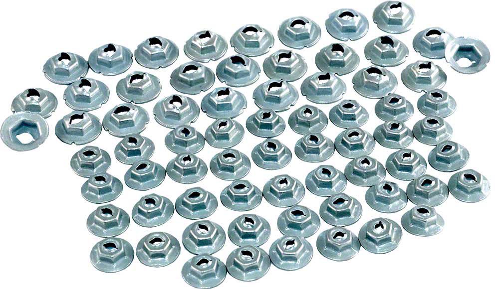 Why spend weeks searching for all the correct size exterior nuts? Our kit supplies enough speed nuts to attach all emblems, numerals, bezels, moldings, side spears, hood grills and scoops, taillamps, parking lamps, side marker lamps and the firewall heater/ac box.
