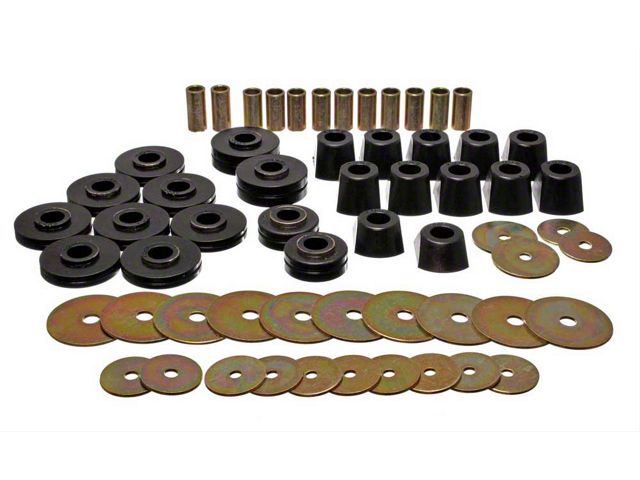 Energy Suspension's body mount kit will replace distorted and worn-out original rubber mounts to maintain truck cab to bed alignment. Original rubber mounts are so soft they often crack, distort, and crush so badly they often fall off. Aluminum body mounts are too harsh for street use that they tend to break and cause other components to break. Energy Suspension's specially formulated Hyper-Flex(r) polyurethane cab and body mounts combine the best qualities of both: they're soft enough for a smooth ride, yet rugged enough for the most demanding road or track. Most sets have a strong zinc plated steel ring molded into them for added durability and when the application requires it.