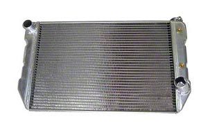 This 2 row aluminum radiator fits V8 big block cars with manual transmissions. This cross flow radiator features 1" tube size and top right bottom lefthose configuration. The aluminum radiators are not the exact same dimensions as original radiators. Because of this our fan shroud may not fit them.