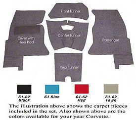 Eckler's no longer carries the 1961-1962 Corvette Tuxedo Carpet Set (Convertible). Please check out 1953-1962 C1 Corvette Interiorfor an updated selection.