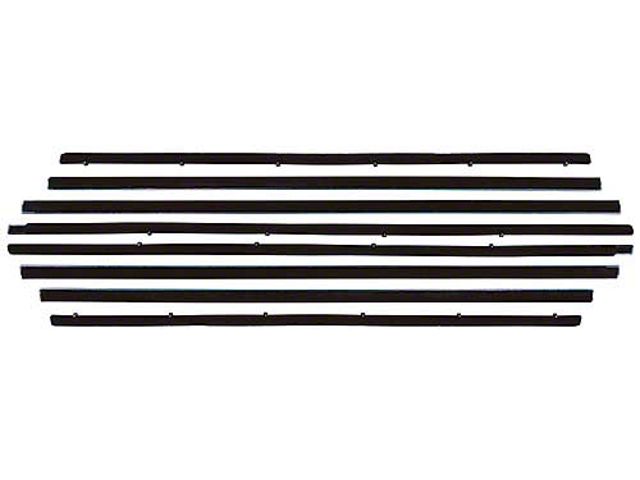 This 8-piece set includes inner and outer beltline for both doors and quarter windows. Clips to install are included as needed. They are for Galaxie and Galaxie 500 2dr. HT models, but not for Starliners. Stop those windows from rattling, and keep the insides of your doors and quarters protected the way Ford designed your car in the first place. This set will provide benefits for years to come!