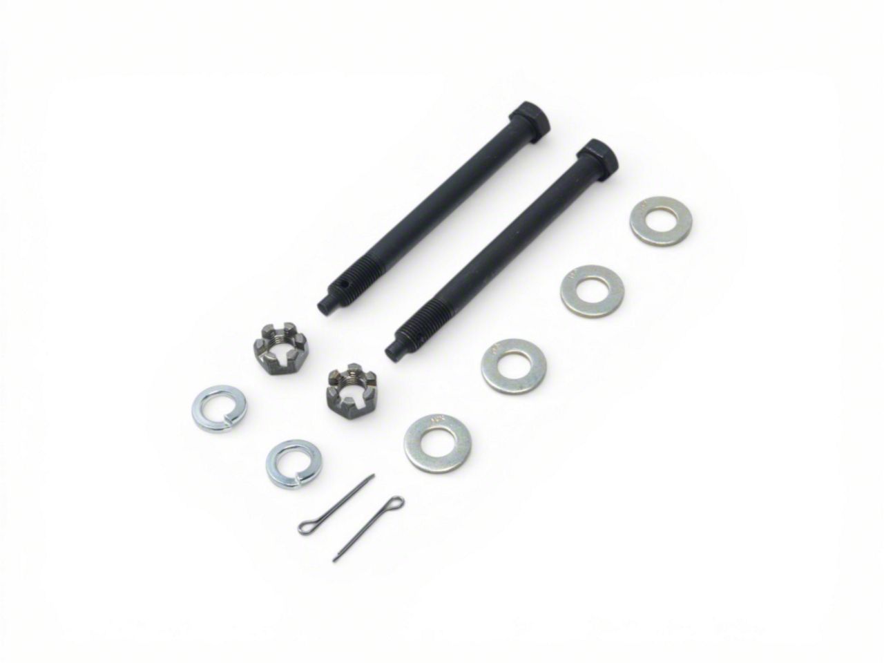 Complete rear suspension mounting kit includes: rear spring mounting kit, rear spring mount bolts, upper and lower rear end mount cushions, differential carrier bolt set, trailing arm bolt set, shock bracket/strut arm nuts and clips, differential front bolt set, differential front bracket bolt set, french locks, french lock bolt set, spring anchor bolt set, trailing arm cotter pins and strut rod adjustment assemblies.