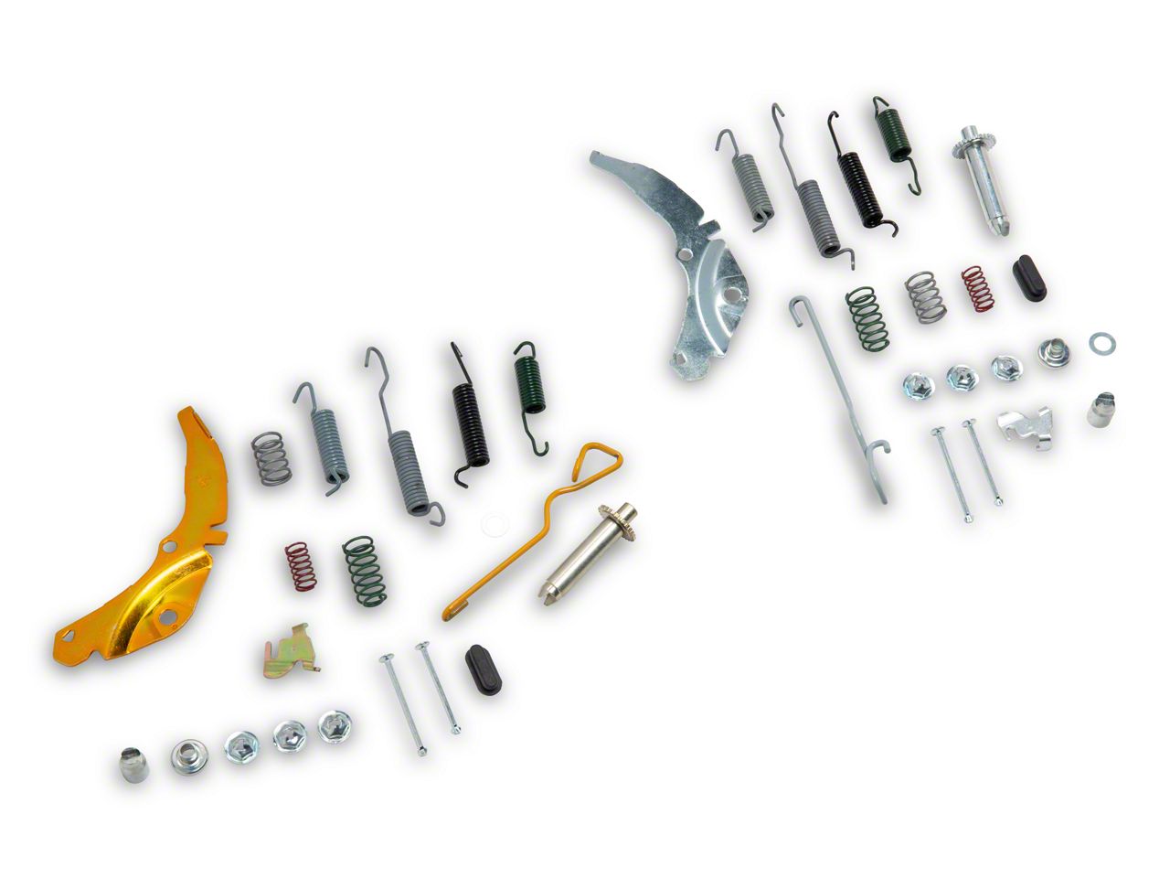 Comprehensive Wheel Brake Hardware Kit. The Wheel Brake Hardware Kit is designed for the front model of 1963-1964 Corvette C1 and 1965 Corvette C1 non-disc brake models, providing all necessary components for a complete brake system overhaul. Featuring a raw metal and lime green finish, this full kit ensures durability and a visually distinct appearance. Built to stock specifications, it guarantees OE compatibility and comparability for a precise fit and reliable performance.