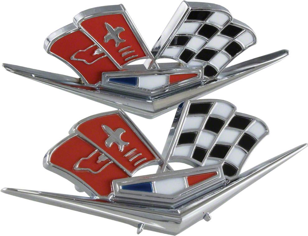 Authentic Reproduction Emblems. The Corvette Side Fender Emblems Light Red are high-quality reproductions designed to match the original components. They feature a distinct light red flag design, perfect for those looking to restore the authentic look of their Corvette C2.