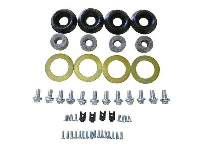 Construction and Appearance. Crafted with high-quality hardware, this kit includes felts, rubber seals, washers, 16 pivot screws, 4 J-clips for side bezels, 8 bezel screws, and 12 bearing cup bolts with star washers. The materials and construction ensure a durable and long-lasting assembly.
