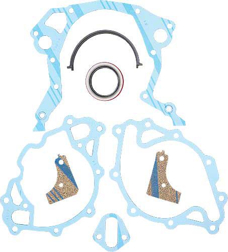 Timing cover set: Contains all gaskets and seals needed for removal & replacement of the timing cover. Will contain oil pan gasket replacement ends if the oil pan gasket must be replaced for proper installation.
