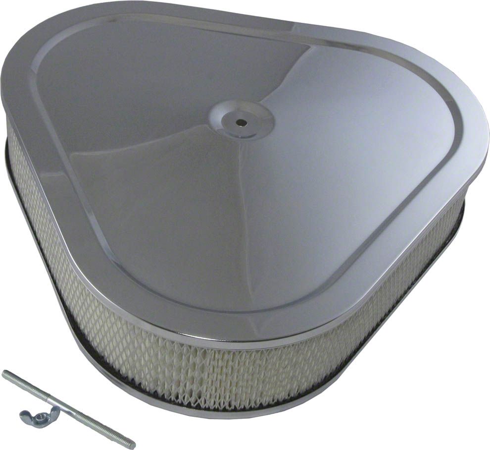 Construction and Appearance. This air cleaner assembly is crafted with high-quality materials, ensuring durability and longevity. It features a 14-inch wide and 3.75-inch tall design with a 3-inch paper element. The top is made from chrome-plated steel, paired with a chrome wing nut, offering a stylish and polished finish that complements any classic Corvette.