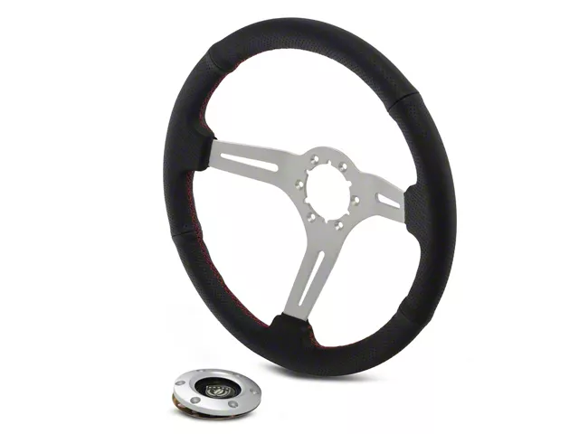 Enhanced Interior Appearance. This Steering Wheel with a 14-inch diameter, black-perforated finish, brushed aluminum slot spokes, and red stitch detailing is designed to enhance the interior appearance of your 1963-1982 Corvette. This steering wheel provides a sleek and stylish look while improving steering grip and comfort. The precision engineering ensures an exact fit, making it a practical and attractive upgrade for your vehicle's interior.
