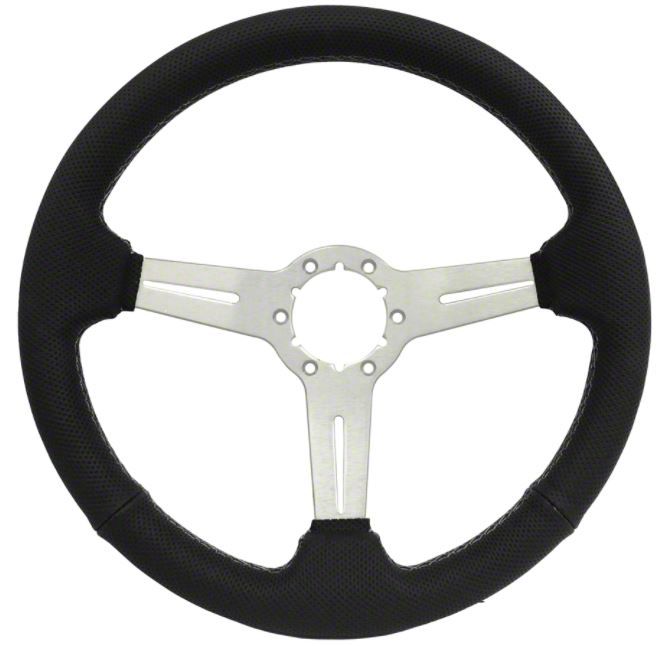 Sporty Aesthetic. The combination of black perforated leather and brushed aluminum slot spokes creates a contemporary and sporty look that perfectly complements your Corvette's interior. This Steering Wheel's stylish design not only enhances the visual appeal of your cabin but also reflects the performance-oriented character of your vehicle.