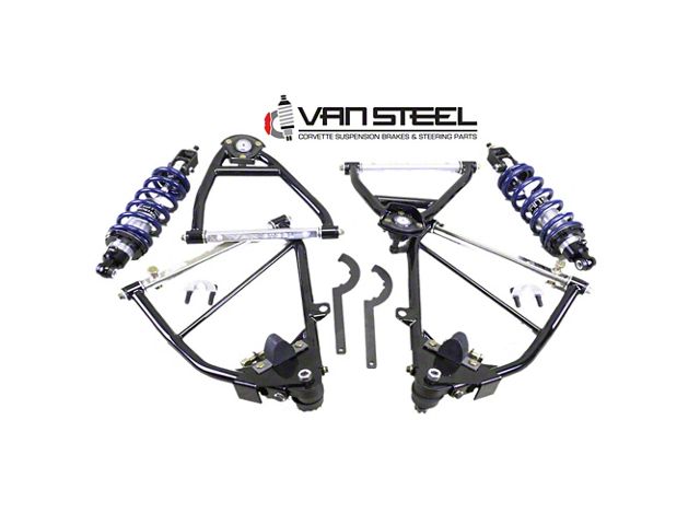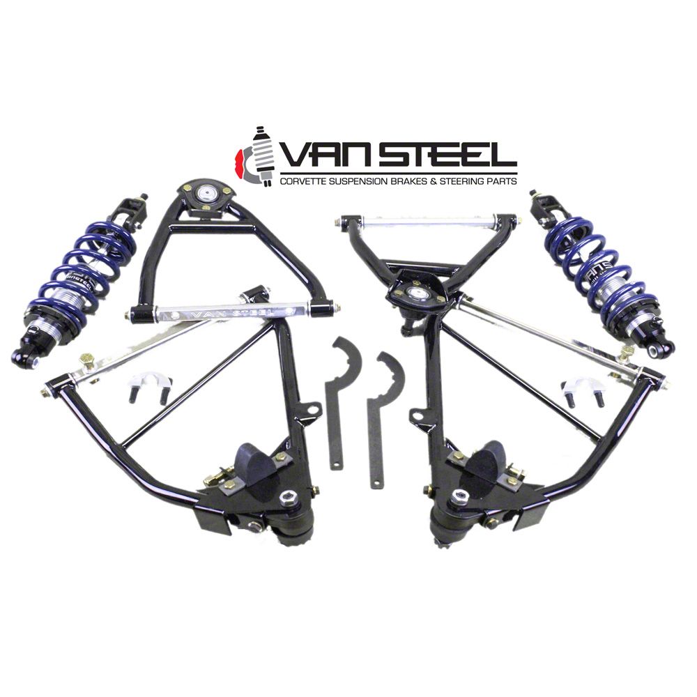 Upgrade your Corvettes suspension with coilover system. You can make adjustments to fit your driving. This kit will lower your front end approx 2" depending on the condition of your current springs. Complete with Chromoly Steel tubular A-Arms with Delrin bushings and new ball joints, this kit will reduce the Corvette weight.They are black powder coated for years of service. The upper A=Arms have a 6 degree positive caster for improved highway stability. Combined with one of the rear systems, you will have control to make any adjustments to fit your driving.