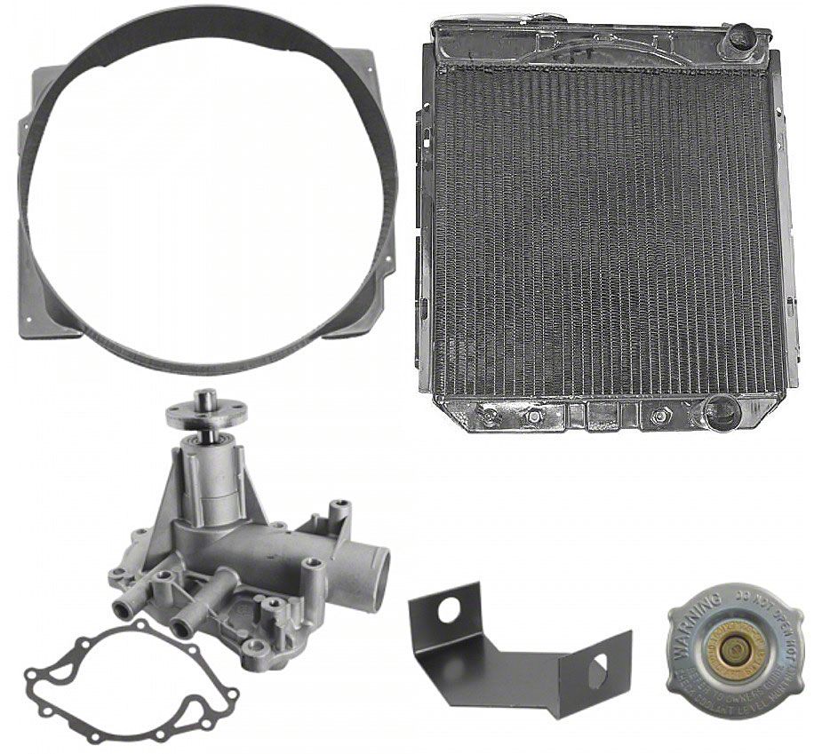 These engine cooling kits offer a discounted price on commonly upgraded and replaced components. Do it all at once and save ! All radiators are US made and come with a one year warranty against defects in workmanship. This kit fits 63-65 Rancheros & Falcons with Windsor small-block engines with heavy-duty cooling and/or air conditioning. The radiator has a 20 - 1/4" center. Fan shrouds do not include mounting hardware, but Ford used standard sizes and styles. This kit includes one 3 row radiator, one fan shroud, one water pump, and one radiator cap.