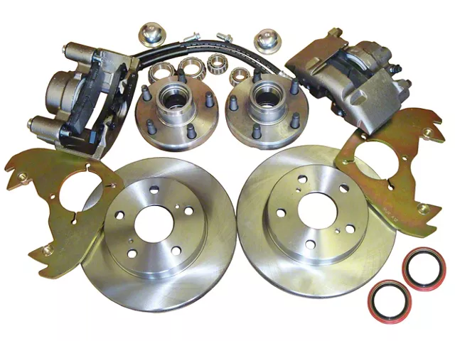 This new disc brake kit features special adapter plates that allows the use of stock spindles. There is no need to remove the spindle (no special tools for ball joint separation or re-installation) and you will not have to have the front end re-aligned, saving time and expense. Additionally, this kit uses a smaller, lower profile caliper that allows the use of most 1968 and later factory 14 inch wheels. Applications also available for 4, 5 or 4 to 5 lug conversion. All disc brake kits come with detailed instructions, and will require custom lines to be run from the master cylinder to the proportioning valve, and from the proportioning valve to the calipers.