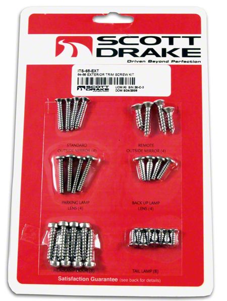 Fits 1964 To 1966 Ford MustangAnother attractive and convenient kit from Scott Drake. Exterior screw kits include outside mirror, parking lamp lens, back up lamp lens, headlamp door and tail lamp screws. Fits 1964 to 1966 Ford Mustang.