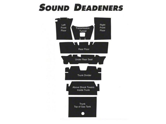 A precision die cut kit, made of the O.E.M. material. Installs easily to reduce road noise & insulate the passenger compartment from heat & cold. This kit includes all pieces originally available for each Mustang model year & body style: left and right front - center transmission hump - rear door - under rear seat - transition - trunk.