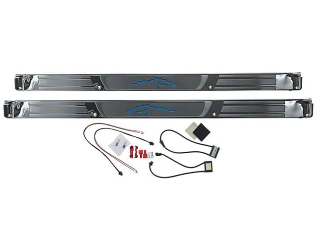 Additionally featured is a custom logo with a cool blue luminescent light that glows when the doors are opened. In daylight or at night, our lighted sill plates will turn heads. Simple installation makes this a “must have” part for your Mustang.