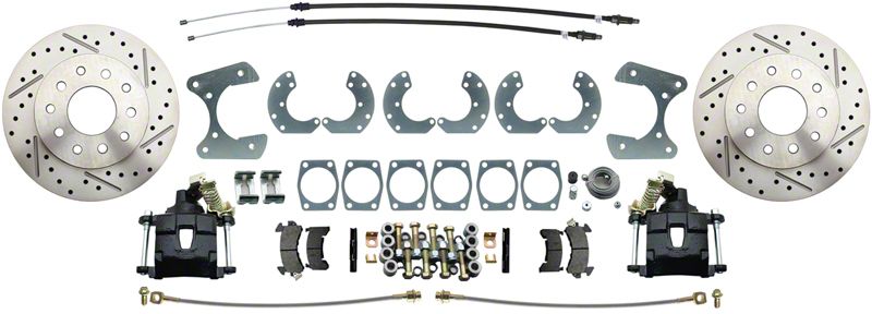 The DBK9 provides an easy to install, bolt on solution for upgrading your pre-1980 Ford passenger car 9" rear-end to disc brake performance. MBM's kit is unique in that it provides all the brackets and flanges that fit the three most popular sizes of the 9" rear end (3-3/8" x 2", 3-1/2" x 2-3/8", 3-9/19" x 2"). This eliminates all guesswork when purchasing and installing the kit. The DBK9 comes in both standard and high performance models. The high performance LX kits upgrade to cross-drilled and slotted rotors and stainless steel braided brake lines.